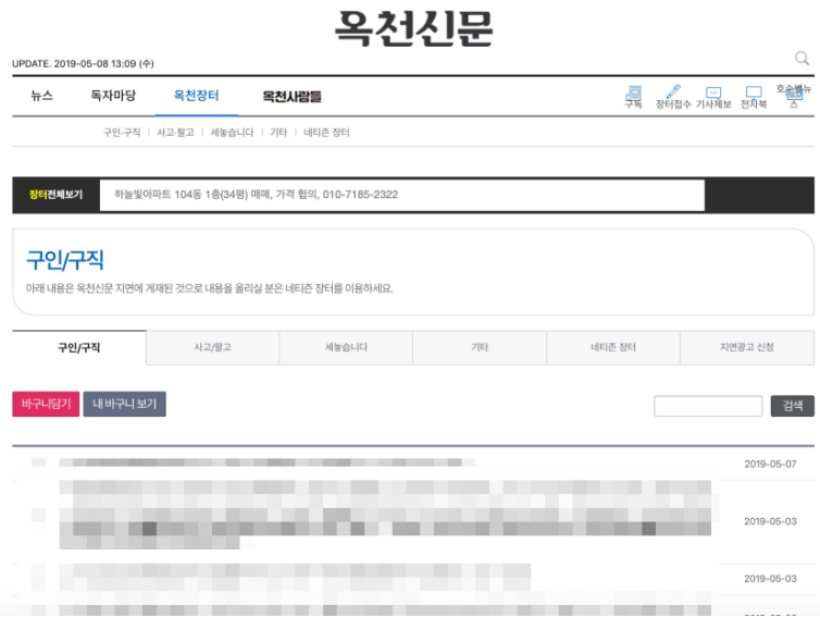 몇 년 전까지만 해도 옥천신문 사이트에는 ‘장터’처럼 쓰이는 게시판이 있어 구인구직, 사고팔기, 방·가게 세놓기 등 다양한 정보를 공유할 수 있었습니다. 중고 가전, 농기계, 농산물, 원룸과 상가 임대 같은 글이 많이 올라와서, 종이로 된 생활정보지 역할을 인터넷이 대신하는 느낌이었습니다. 지역 주민들이 직접 글을 올리고 서로 연락하면서 거래가 이루어졌기 때문에, 동네 사람들끼리 믿고 이용하는 장터 분위기가 있었습니다.