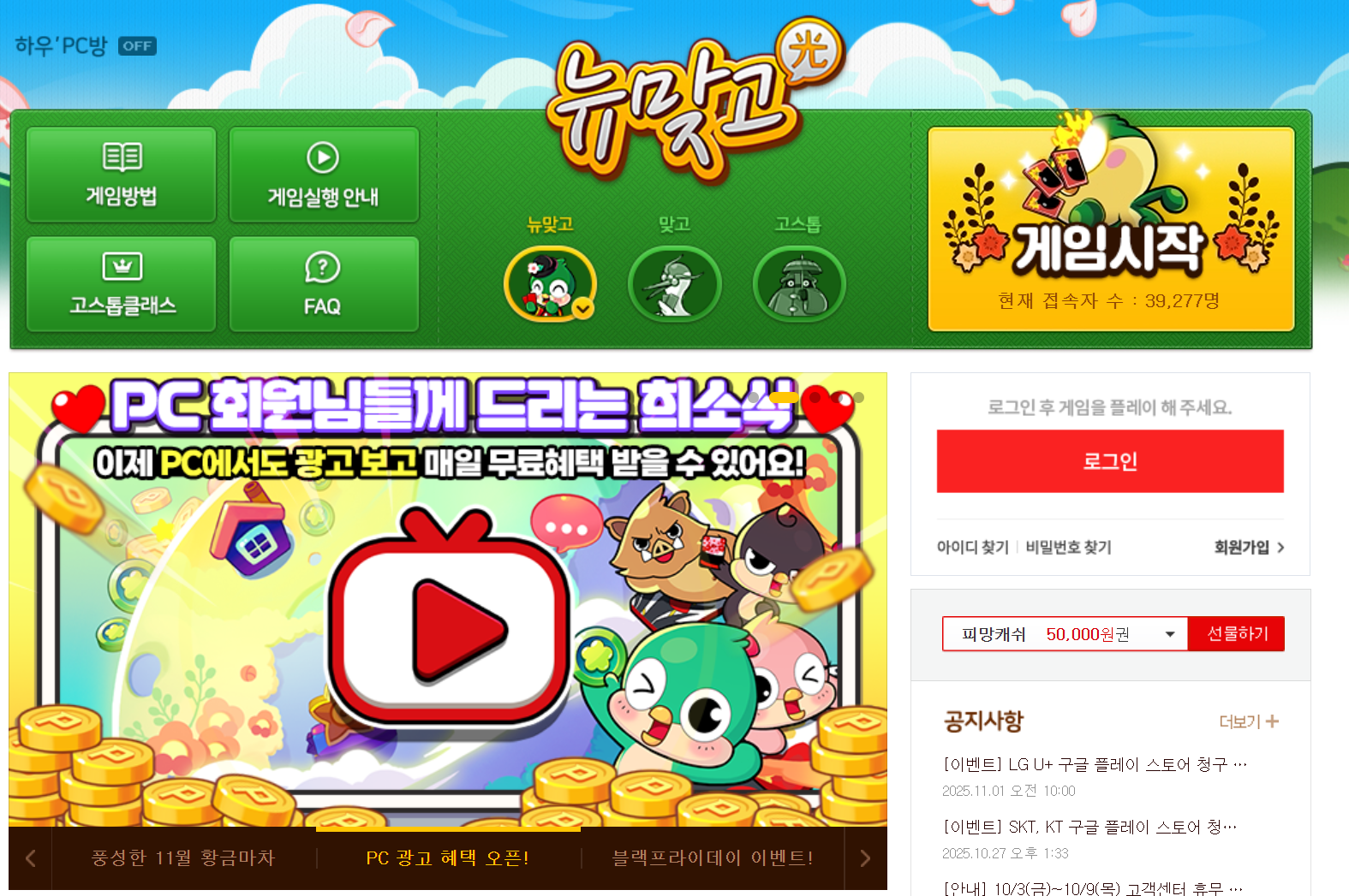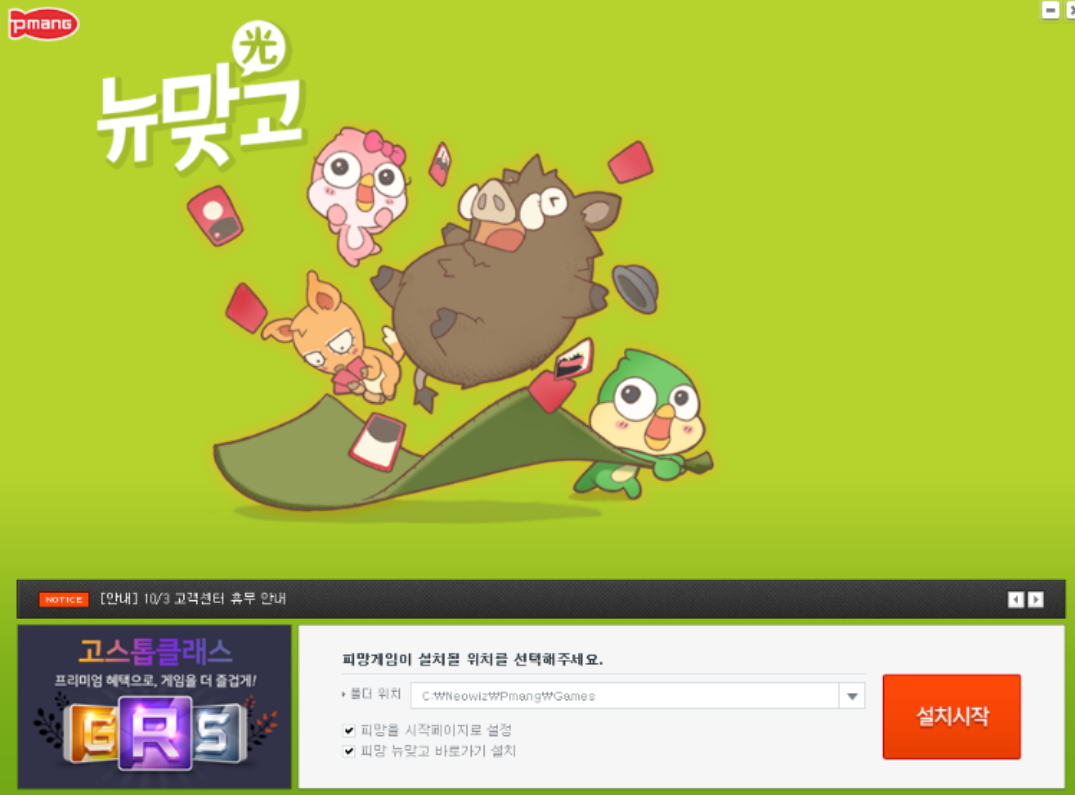 처음 이용하는 경우라면 ‘게임시작’ 버튼을 눌렀을 때 게임이 바로 켜지는 것이 아니라, ‘피망 스타터(Pmang Starter)’라는 설치 관리 프로그램이 먼저 실행됩니다. 이는 게임을 구동하기 위한 필수 프로그램이므로 당황하지 마시고 설치를 진행해 주시면 됩니다.