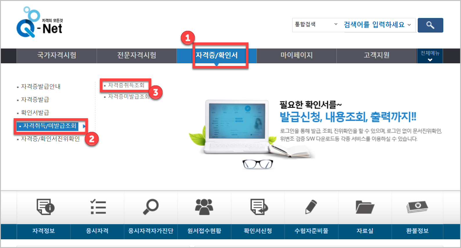 한국산업인력공단에서 관리하는 국가기술자격 자격증은 대부분 큐넷(Q-Net)에서 조회가 가능합니다. 큐넷은 시험 접수, 합격자 발표, 자격증 발급·조회 등 자격 관련 업무만을 위해 운영되는 전용 사이트입니다.