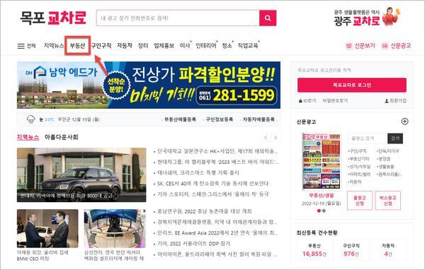 목포 교차로 홈페이지 메인 화면에 들어가면 상단 혹은 화면 중앙에 여러 카테고리가 보입니다. 지역 소식, 생활 정보, 광고 등 다양한 메뉴가 보이는데, 이 가운데에서 ‘부동산’ 또는 비슷한 이름의 메뉴를 찾아 클릭하면 해당 페이지로 이동합니다. 이 섹션에서는 아파트, 오피스텔, 상가, 원룸, 토지 등 목포 지역과 인근 지역의 부동산 매물을 한눈에 확인할 수 있습니다.