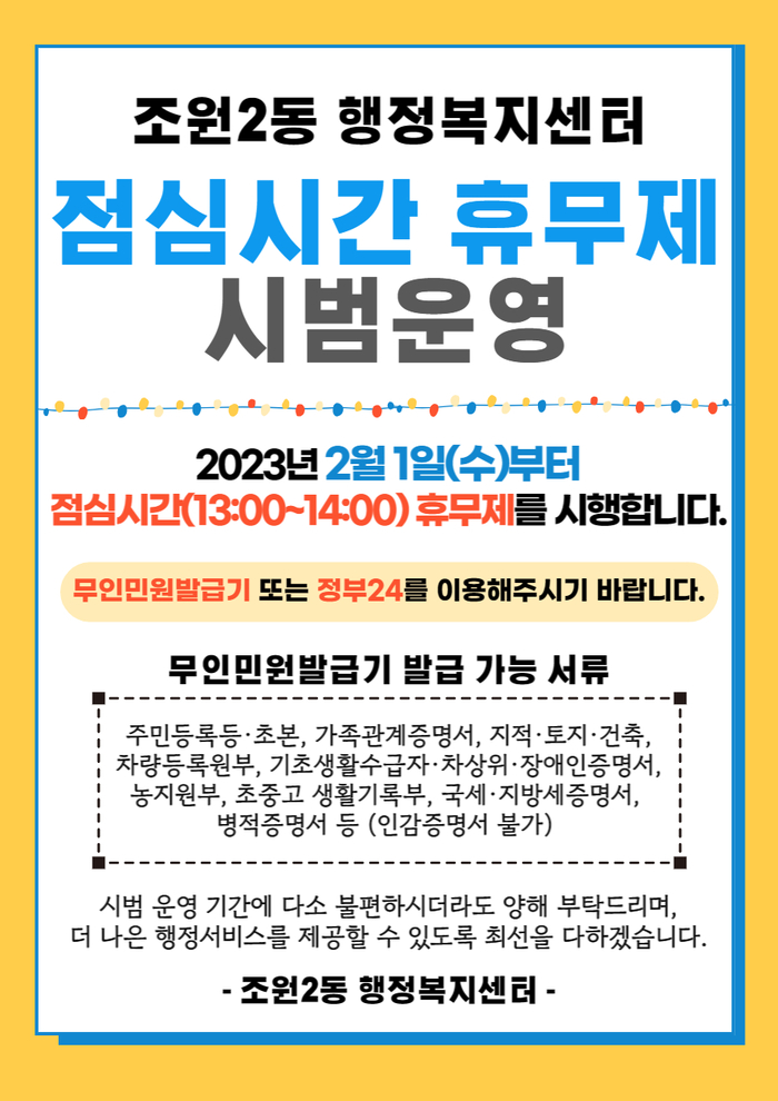 행정복지센터는 우리 일상에서 꼭 필요한 역할을 하는 기관입니다. 예전에는 ‘동사무소’라는 이름으로 더 익숙했지만, 지금은 주민 복지 기능이 크게 강화되면서 ‘행정복지센터’라는 명칭이 일반적으로 사용되고 있습니다. 주민등록등본, 가족관계증명서 같은 각종 증명서 발급부터 재난지원금, 각종 복지급여와 바우처 신청, 그리고 생활과 밀접한 민원까지 한 번에 처리할 수 있는 곳입니다. 그래서 정부 관련 업무를 하다 보면 자연스럽게 한 번쯤은 방문하게 되는 공간입니다. 행정복지센터 점심시간 안내합니다.