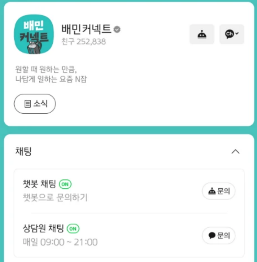 카카오톡을 자주 사용한다면, 배민커넥트 관련 카카오톡 채널을 추가해 두는 것도 좋은 방법입니다. 카카오톡 채널에서는 신규 가입 관련 문의, 시간제 보험 안내, 서류 발급, 정산 확인 등 비교적 행정·안내 중심의 상담을 받는 경우가 많습니다. 앱이나 전화를 사용하기 애매한 상황에서 간단히 텍스트로 문의하기 좋아서, 대기 시간에 부담 없이 이용할 수 있습니다.