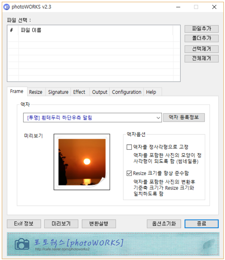 예전에는 포토웍스 전용 홈페이지에서 프로그램을 배포했던 시기가 있었던 것으로 알려져 있습니다. 다만 개인이 홈페이지를 상시 운영하기에는 비용과 관리 부담이 만만치 않기 때문에, 현재는 네이버 카페에서 프로그램을 배포하고 있습니다. 개발자가 개인적인 시간에 유지·보수를 하는 형태라, 상업용 서비스처럼 빠르게 버전이 올라가지는 않습니다.