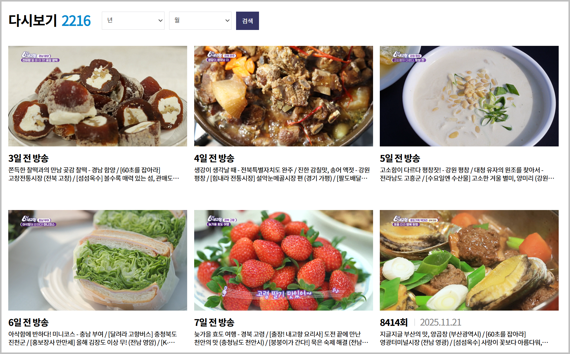6시 내고향 누리집에서는 단순히 방송 다시 보기만 제공하는 것이 아니라, 각 회차별로 방송에 나온 정보들을 꽤 알기 쉽게 정리해두고 있습니다. 특히 방송을 보고 나서 다시 찾아가고 싶은 장소가 있을 때, 누리집을 이용하면 편리합니다.