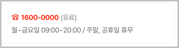 전화번호 정리하면 위와 같습니다 1600-0000 번호이지요. 월~금 09시부터 20까지 운영을 하고 있씁니다. 주말 공휴일은 휴무입니다.