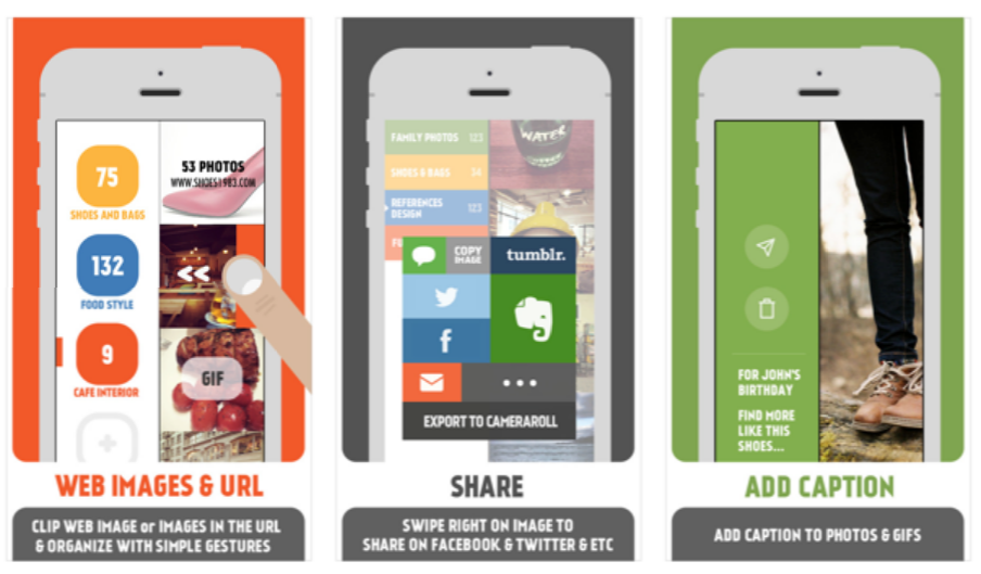 또한 특정 사이트에 있는 모든 이미지들과 아이폰의 스크린 샷도 단 한 번의 클릭으로 수집을 할 수 있고, 수집한 이미지를 폴더별로 정리할 수 있습니다. 이렇게 수집된 이미지는 드롭박스에 저장이 가능합니다.